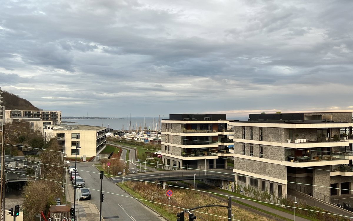 Fra dette værelse kan man nyde en fantastisk udsigt over Aarhus Ø, havet og byens skyline. Der er også en charmerende indskudt altan, der tilfører boligen ekstra værdi og stemning.