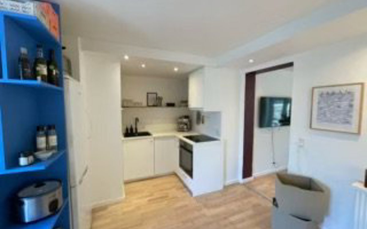 Boligen rummer to værelser, hvoraf det ene er et åbent køkken-alrum med stue. Køkkenet er opført med nyere elementer, en flot træbordplade og fremstår lyst og indbydende. I 2015 blev køkkenet istandsat, og samtidig blev hårde hvidevarer udskiftet.